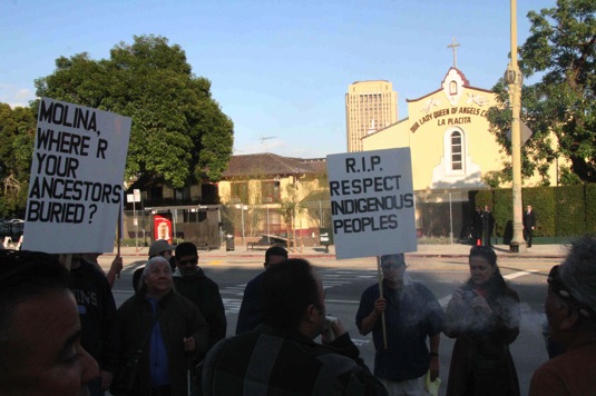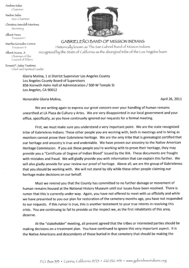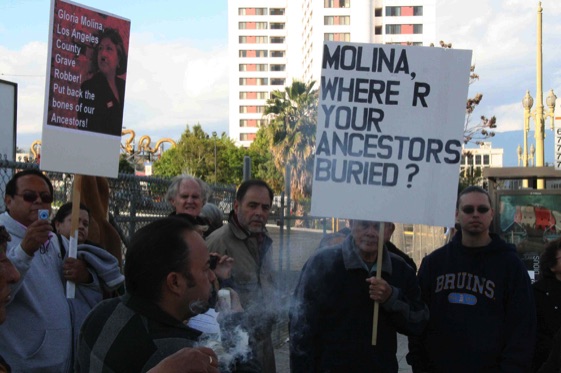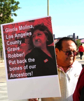 Christina Swindall-Martinez, secretary for the Gabrieleño Band of Mission Indians whose Ancestors are buried at the site, told the Associated Press that tribe members pleaded with museum and county officials to delay the opening until an agreement could be reached on reburial of the remains and restoration of the cemetery. "She said members felt particularly affronted by Los Angeles County Supervisor Gloria Molina, who has long championed the project, serves on its board and was scheduled to be honored at the gala."